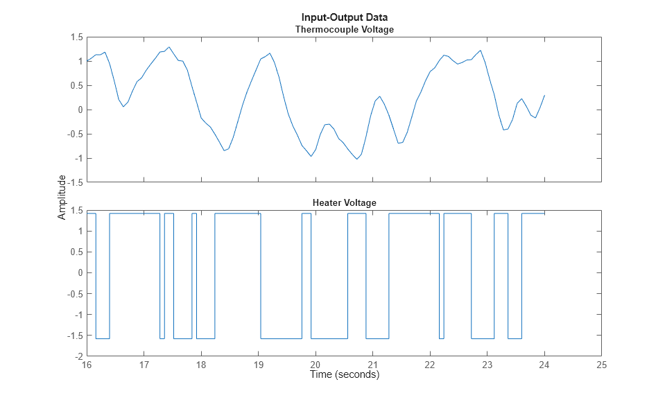 Vector y2, the output, contains 1000 measurements of the thermocouple voltage which is proportional to the temperature in the outlet airstream. Vector u2 contains 1000 input data points consisting of the voltage applied to the heater. The input was generated as a binary random sequence that switches from one level to the other with probability 0.2. The sample time is 0.08 seconds.