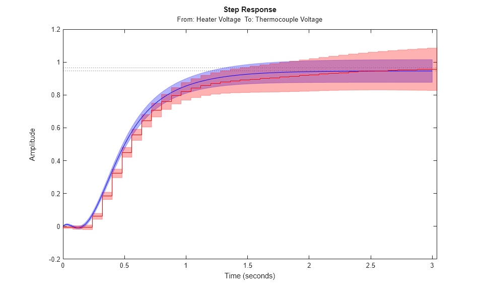 Similarly, we can generate the step plot and its associated 3 standard deviation confidence region. We can compare the responses and associated variances of the parametric model m1 with that of the nonparametric model mi: