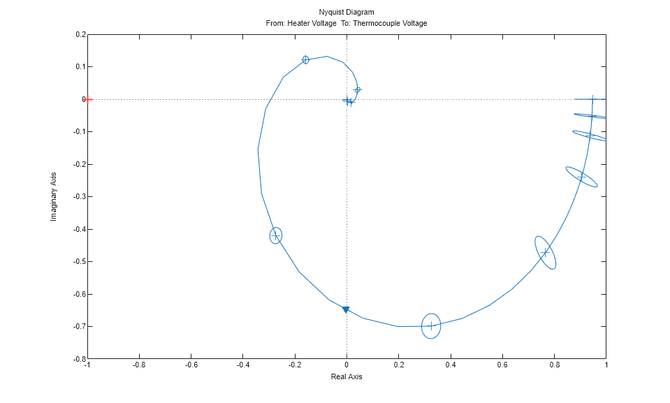 Also, a Nyquist plot can be analyzed with the uncertainty regions marked at certain frequencies: