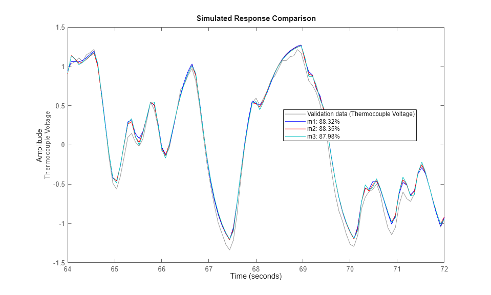 To compare the performance of the models that we have estimated, for example m1, m2 and m3 with the validation data zv, we can again use the compare command: