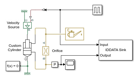 In the hydraulic cavitation cycle for this example, the fluid in a custom double-acting cylinder can cavitate and recover. During the repeating cycle of oscillating pressure, the absolute pressure does not drop below absolute zero as the bulk modulus of the homogeneous liquid-gas mixture decreases accordingly at low pressures. The input to this system is a velocity source, and the output observed is the absolute pressure in the cylinder chambers.
