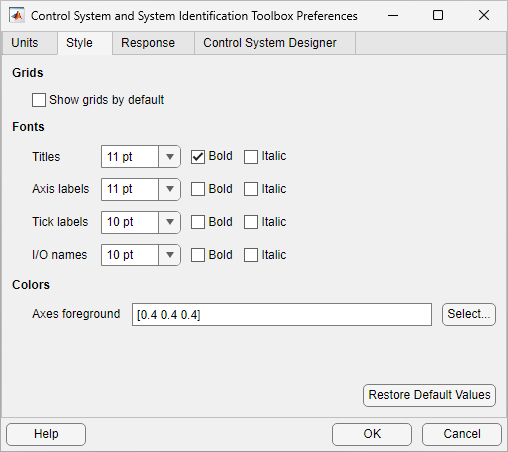 The Control System and System Identification Toolbox Preferences dialog box allows you to set plot preferences that persist from session to session.