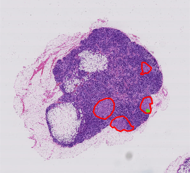 Display the labeled blocked image overlaid on the original image. The regions corresponding to the tumor and normal tissue polygons of the groundTruth object are shown in red and green, respectively. To distinguish the normal tissue outside of the ROIs from the background using a binary mask, see Create Labeled Blocked Image from ROIs and Masks.