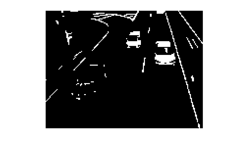 darkCarValue = 50; darkCar = im2gray(read(trafficVid,71)); noDarkCar = imextendedmax(darkCar, darkCarValue); imshow(darkCar) figure, imshow(noDarkCar)