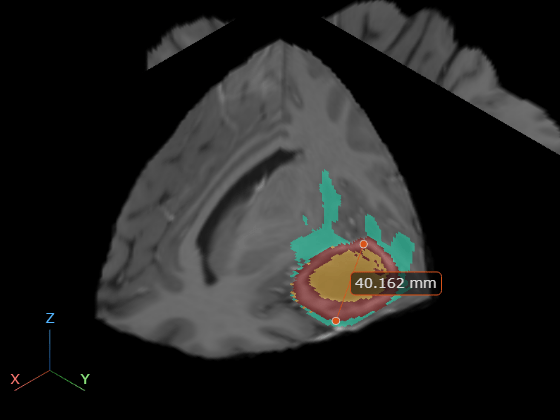 Interactively measure the tumor size in the current transverse slice. Rotate the volume to view the transverse plane by clicking the Z axis indicator in the lower-left corner of the viewer. To facilitate accurate measurement, zoom in on the region containing the tumor. Then, in the Viewer3D toolstrip, pause on the point annotation icon