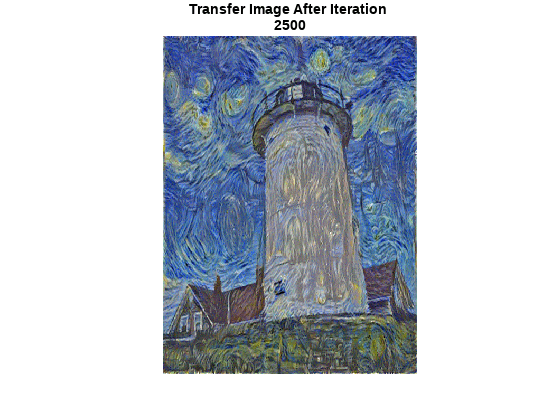 figure minimumLoss = inf; for iteration = 1:numIterations % Evaluate the transfer image gradients and state using dlfeval and the % imageGradients function listed at the end of the example [grad,losses] = dlfeval(@imageGradients,net,dlTransfer, ... contentFeatures,styleFeatures,styleTransferOptions); [dlTransfer,trailingAvg,trailingAvgSq] = adamupdate( ... dlTransfer,grad,trailingAvg,trailingAvgSq,iteration,learningRate); if losses.totalLoss < minimumLoss minimumLoss = losses.totalLoss; dlOutput = dlTransfer; end % Display the transfer image on the first iteration and after every 50 % iterations. The postprocessing steps are described in the "Postprocess % Transfer Image for Display" section of this example if mod(iteration,50) == 0 || (iteration == 1) transferImage = gather(extractdata(dlTransfer)); transferImage = transferImage + meanVggNet; transferImage = uint8(transferImage); transferImage = imresize(transferImage,size(contentImage,[1 2])); image(transferImage) title(["Transfer Image After Iteration ",num2str(iteration)]) axis off image drawnow end end