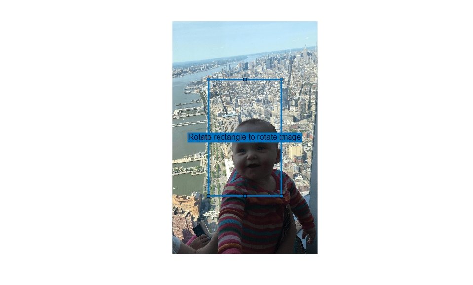 Create a rotatable Rectangle ROI at the specified position and set the Rotatable property to true. You can then rotate the rectangle by clicking and dragging near the corners. As the ROI moves, it broadcasts an event MovingROI. By adding a listener for that event and a callback function that executes when the event occurs, you can rotate the image in response to movements of the ROI.