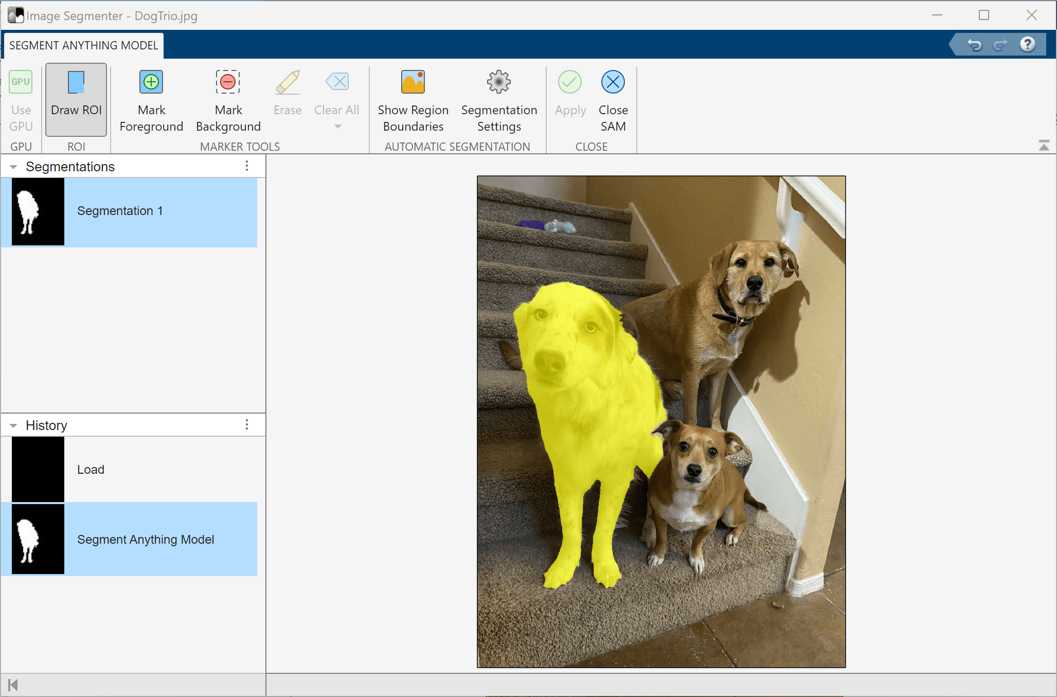 On the Image Segmenter app toolstrip, in the Segmentation Tools section, select Segment Anything Model.