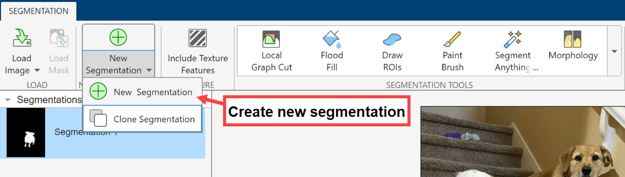 On the Image Segmenter app toolstrip, in the Segmentation Tools section, select Segment Anything Model. To create a new mask, on the Segmentation tab of the Image Segmenter app, in the app toolstrip, select New Segmentation, then New Segmentation.