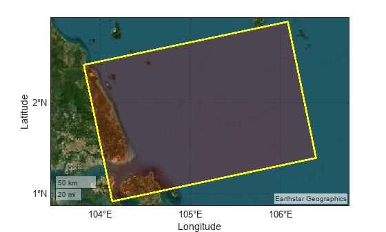 Create a large-scale test image of the Singapore Strait region. Get the world x-y coordinates representing the geographic extent of the region using mappolyshape (Mapping Toolbox) object.