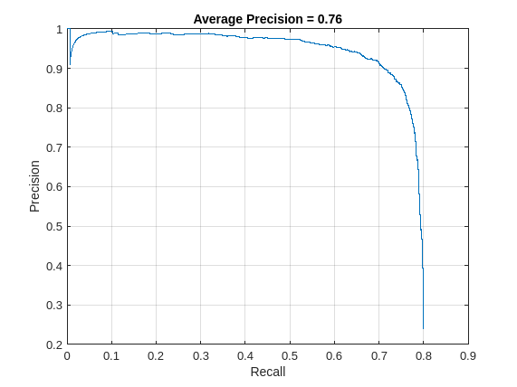 Evaluate the object detector using the average precision metric using the evaluateObjectDetection function. Compute the precision and recall using the precisionRecall object function.