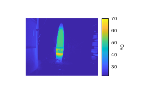 Convert the captured image data to °C using the ax5degC helper function with the temperature resolution value k. The helper functions used in this example are attached as supporting files in the same directory as this example file.