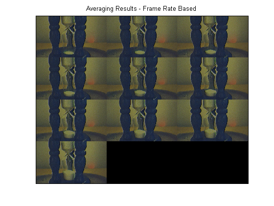% Display the resulting averages of the acquired frames. % Notice the change in the lower chamber of the hourglass over time. imaqmontage(userdata.average); title('Averaging Results - Frame Rate Based');