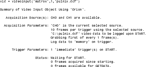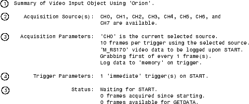 The title of the summary includes the name of the image acquisition device this object represents. In the example, this is a Matrox Orion frame grabber.