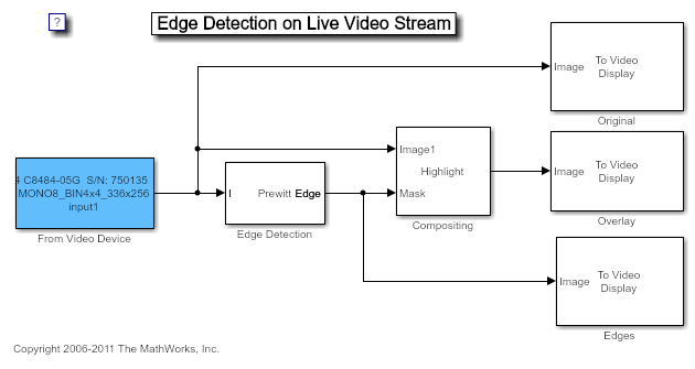 This example uses the From Video Device block to acquire live image data from a Hamamatsu C8484 camera into Simulink. The Prewitt method is applied to find the edges of objects in the input video stream.