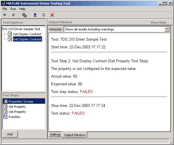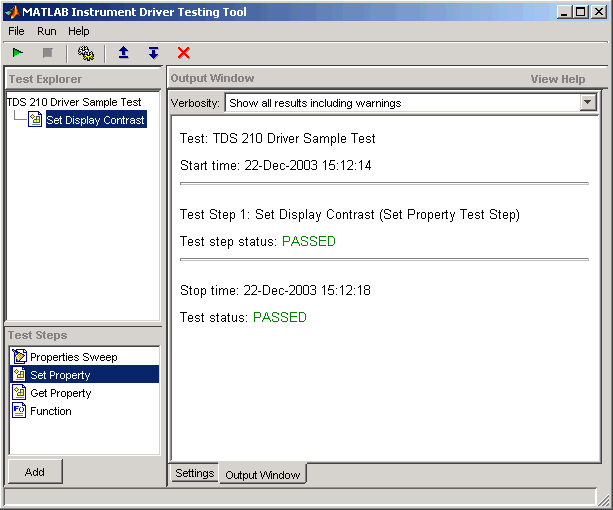The Output Window is updated as each property in the sweep is tested. Note that the entire sweep is only one step in the overall test.