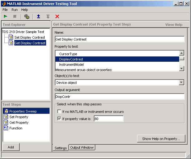 The settings for the get property step are the same as for a Test Step: Set Property, except that instead of providing a value to write, you can provide an output argument variable.
