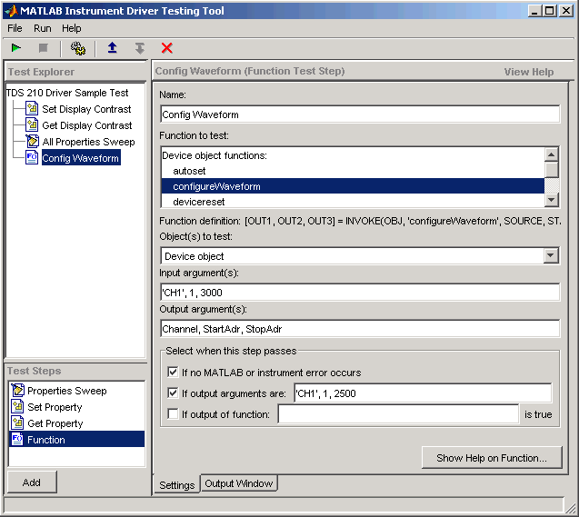 A function test step sends a function call to the instrument. You select the function called, the input data and output arguments (if required), and the conditions for passing.