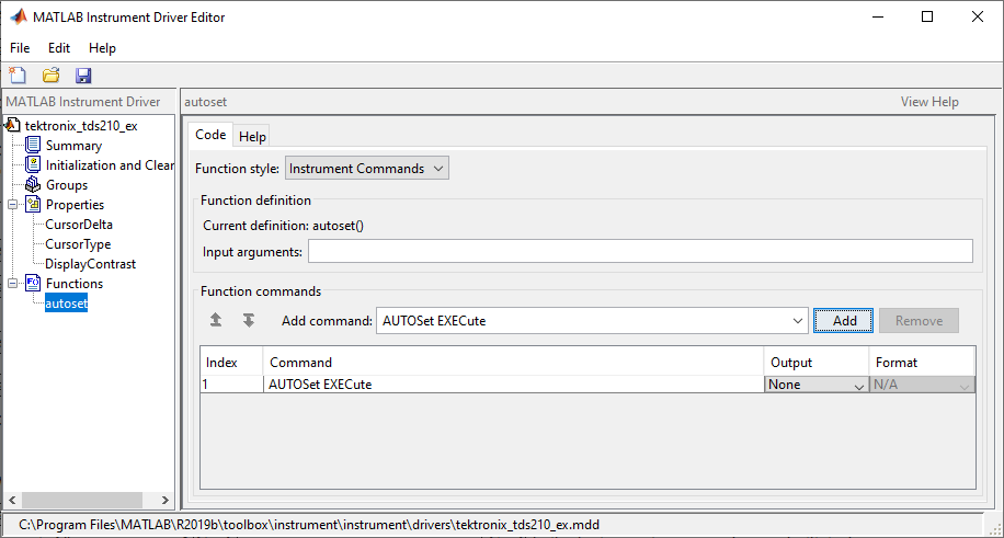 This example creates a function that will cause the Tektronix® TDS 210 oscilloscope to adjust its vertical, horizontal and trigger controls to display a stable waveform. In the MATLAB instrument driver editor,
