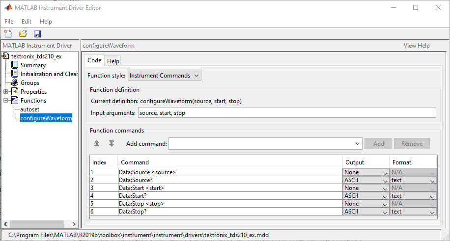• In the Help text field, enter [SOURCE, START, STOP] = INVOKE(OBJ, 'configureWaveform', SOURCE, START, STOP) configures the waveform that will be transferred from the oscilloscope.
