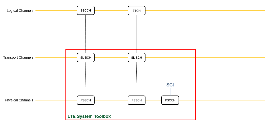 System sidelink data follows the indicated mapping between logical channels, transport channels, and physical channels. The red outline contains LTE Toolbox sidelink functionality for physical channels, transport channels, and control information.