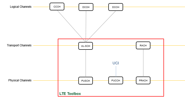 System uplink data follows the indicated mapping between logical channels, transport channels, and physical channels. The red outline contains LTE Toolbox uplink functionality for physical channels, transport channels, and control information.