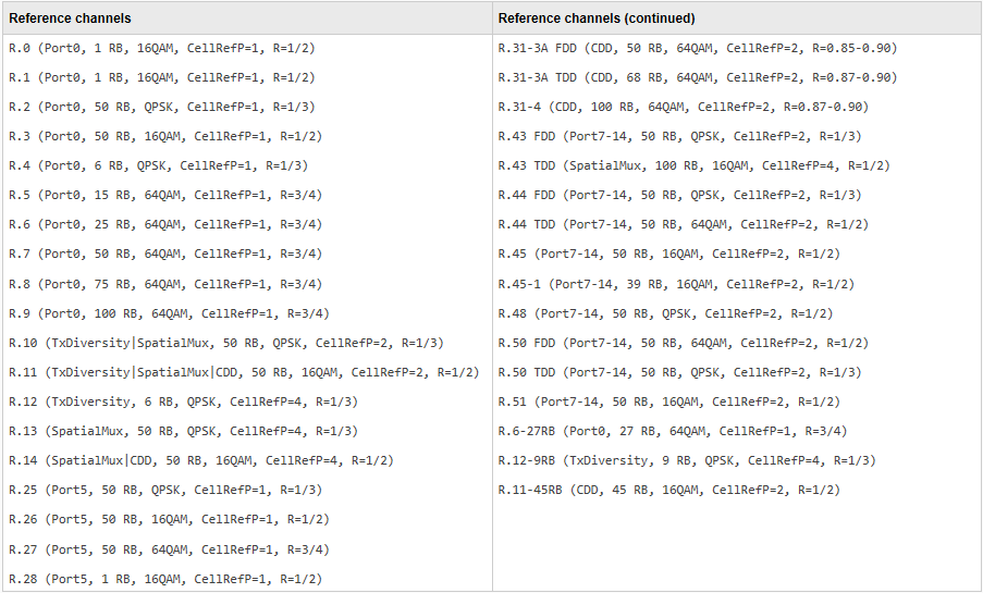 lteRMCDLfunction supports a number of standard defined parameter sets in the form of RMCs. If there is a configuration that exactly matches the requirements or if we want to generate a waveform corresponding to an RMC, we can use that RMC number directly for RMC table lookup and parameter set creation. The RMCs supported and its top-level parameters are shown below: