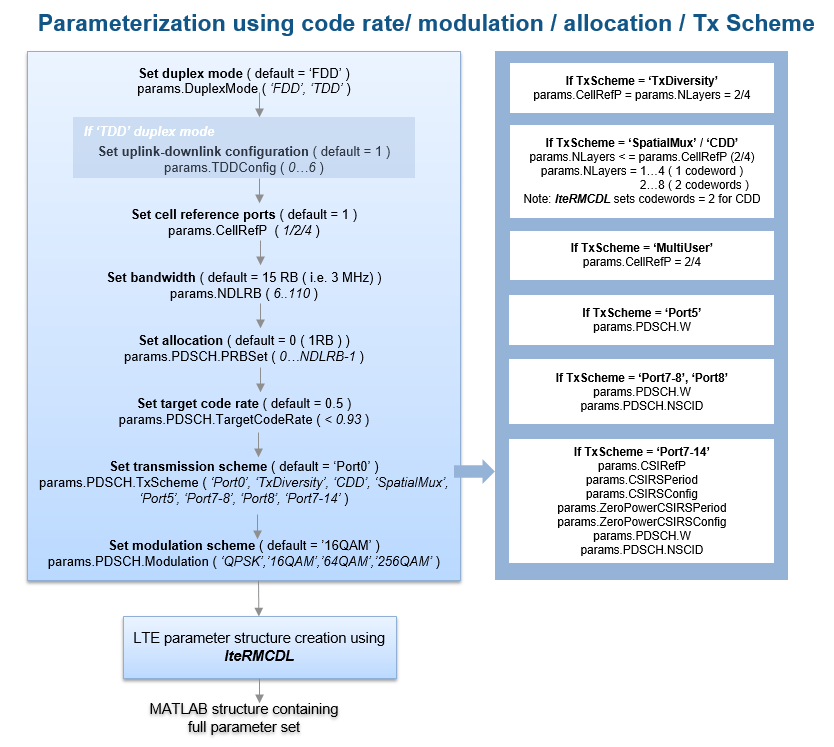 The toolbox includes the lteRMCDL function, which can provide a fully populated parameter structure for the pre-configured Reference Measurement Channels (RMC) as well as custom configurations. This parameter structure can be directly used by the lteRMCDLTool function to generate the waveforms or it can be used as a template for creating waveforms with user specified values for any of the constituent channels or signals. For example, changing the transmission scheme/mode, modulation scheme, code rate or changing the power level of the physical channels. It is important to note that all the user provided values are defined prior to calling the lteRMCDL function. This is because the lteRMCDL function does not overwrite any parameter values already defined at the input (except for read-only parameters). The following diagram shows parameterization for typical simulation setups.