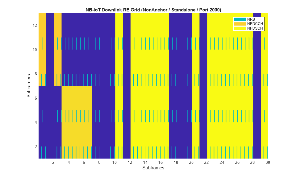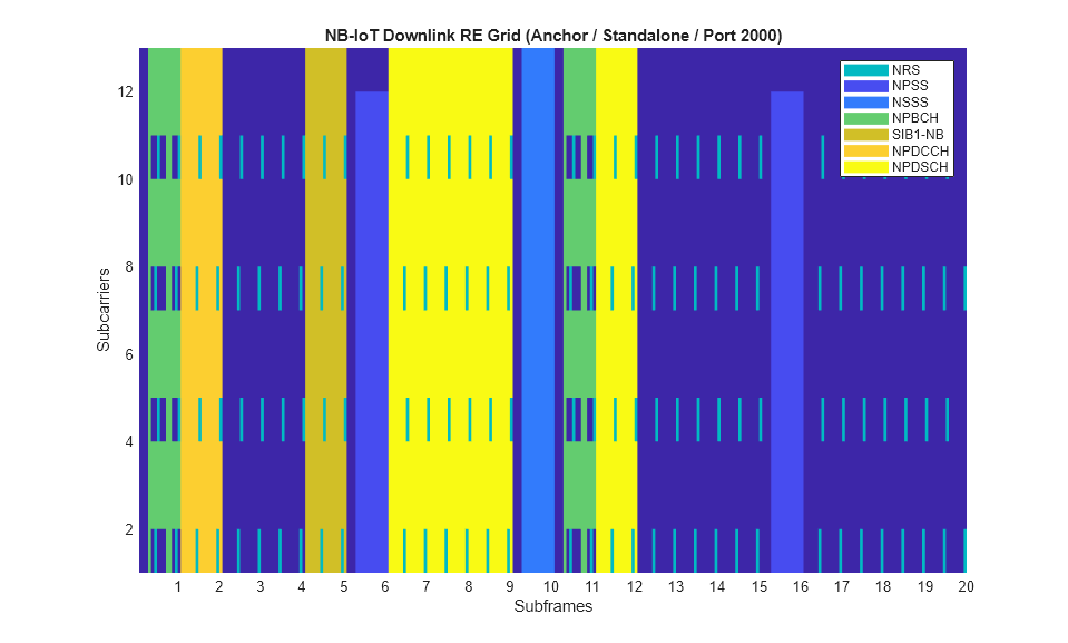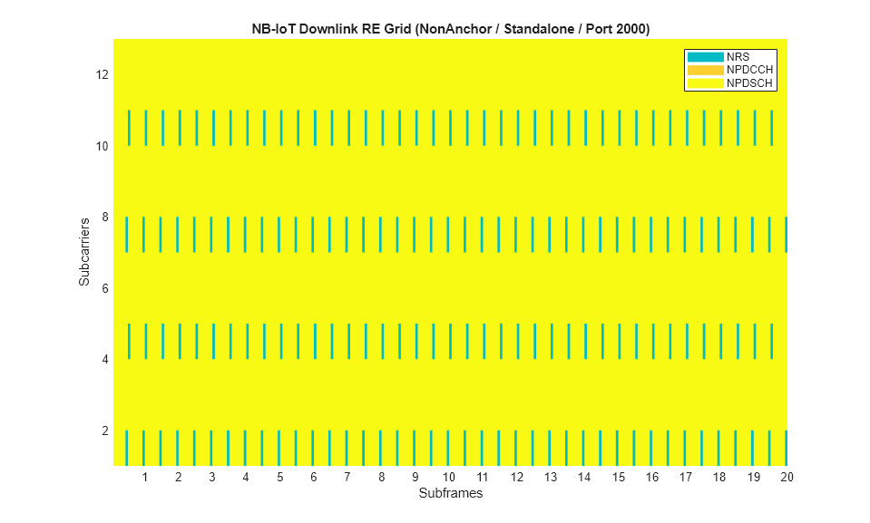 In addition to the subframe allocation described above, the generated grids below further explain the RE allocation in a subframe. The grid is for two frames of an anchor carrier containing NPSS, NSSS, NRS, NPBCH, SIB1-NB and NB-IoT downlink subframes carrying NPDSCH and NPDCCH. The grids are compared in Standalone and Inband-SamePCI operation modes. The grid can be generated using the grid display method in the class NBIoTDownlinkWaveformGenerator, i.e., creating an object ngen of type NBIoTDownlinkWaveformGenerator and calling ngen.displayResourceGrid.