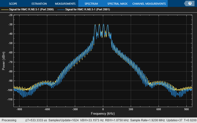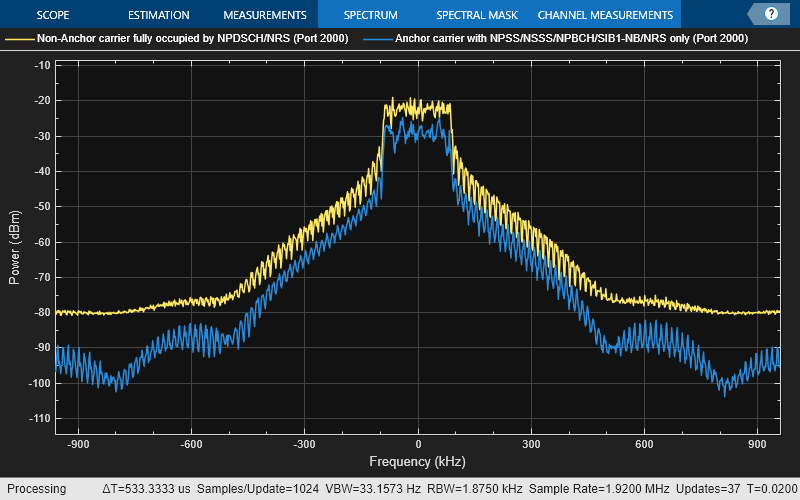 rc = 'R.NB.5-1'; % Allowed values are 'R.NB.5','R.NB.5-1','R.NB.6','R.NB.6-1','R.NB.7','R.NB.8','R.NB.9','N-TM' ngen = NBIoTDownlinkWaveformGenerator(rc); [waveform,grid,ofdmInfo] = ngen.generateWaveform; ofdmInfo % Display OFDM configuration spectrumScope = spectrumAnalyzer; spectrumScope.SampleRate = ofdmInfo.SamplingRate; spectrumScope.ShowLegend = true; if ngen.Config.NBRefP == 1 spectrumScope.ChannelNames = {['Signal for RMC ' rc ' (Port 2000)']}; spectrumScope(waveform); else % NBRefP == 2 spectrumScope.ChannelNames = {['Signal for RMC ' rc ' (Port 2000)'], ... ['Signal for RMC ' rc ' (Port 2001)']}; spectrumScope(waveform(:,1),waveform(:,2)); end