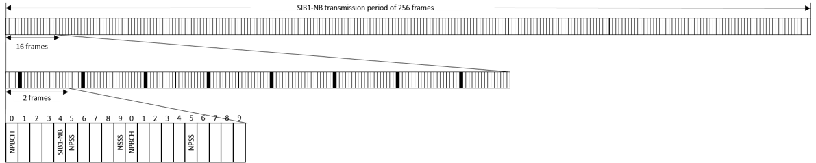 A SIB1-NB is carried in 8 subframes (NSF = 8), and mapped to subframe 4 in every other frame in 16 continuous frames which are repeated NRep times (NRep = 4, 8 or 16, see TS 36.213 section 16.4.1.3 Table 16.4.1.3-3 [ 3 ]). The repetitions are equally spaced within a period of 256 frames (TS 36.331 section 5.2.1.2a [ 5 ]). The starting frame number for the first NPDSCH transmission in the period depends on the narrowband physical cell identity NNCellID as well as the number of repetitions NRep (TS 36.213 Table 16.4.1.3-4 [ 3 ]).