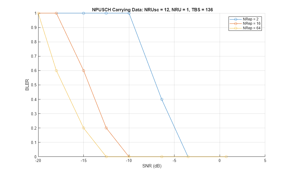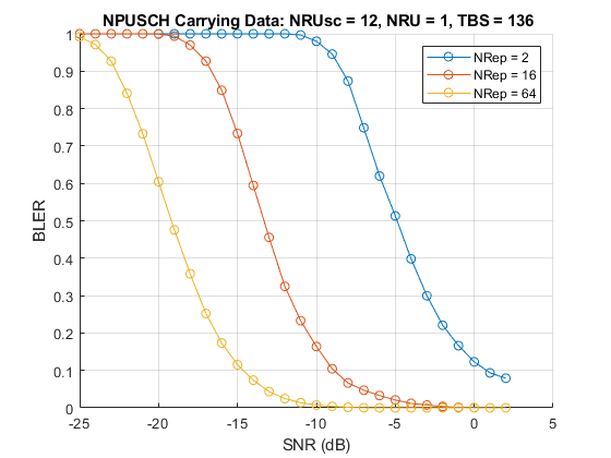 numTrBlks = 5; % Number of simulated transport blocks SNRdB = [-20 -18 -15 -12.5 -10 -6.4 -3.5 0.7]; % Range of SNR values in dB simReps = [2 16 64]; % Repetitions to simulate
