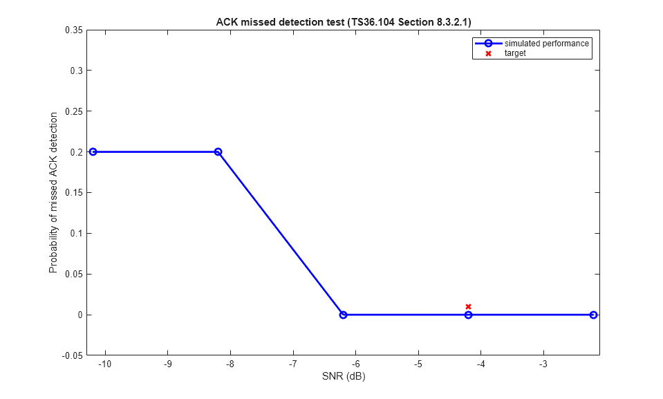 This example uses a simulation length of 10 subframes. This value has been chosen to speed up the simulation. A higher value should be chosen to obtain more accurate results. The probability of erroneous ACK detection is calculated for a number of SNR point. The target defined in TS36.104 Section 8.3.2.1 [ 1 ] for 1.4 MHz bandwidth (6 RBs) and a single transmit antenna is an ACK missed detection probability not exceeding 1% at an SNR of -4.2 dB. The test is defined for 1 transmit antenna.