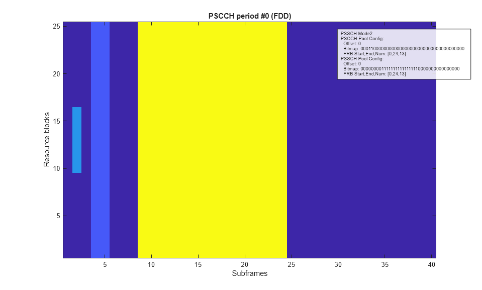 In order to illustrate the control and shared resource pools, the period.displayPeriod function is called which creates a plot showing the locations of the synchronization transmission (light blue), control resource pool (dark blue) and shared resource pool (yellow) within the PSCCH period.