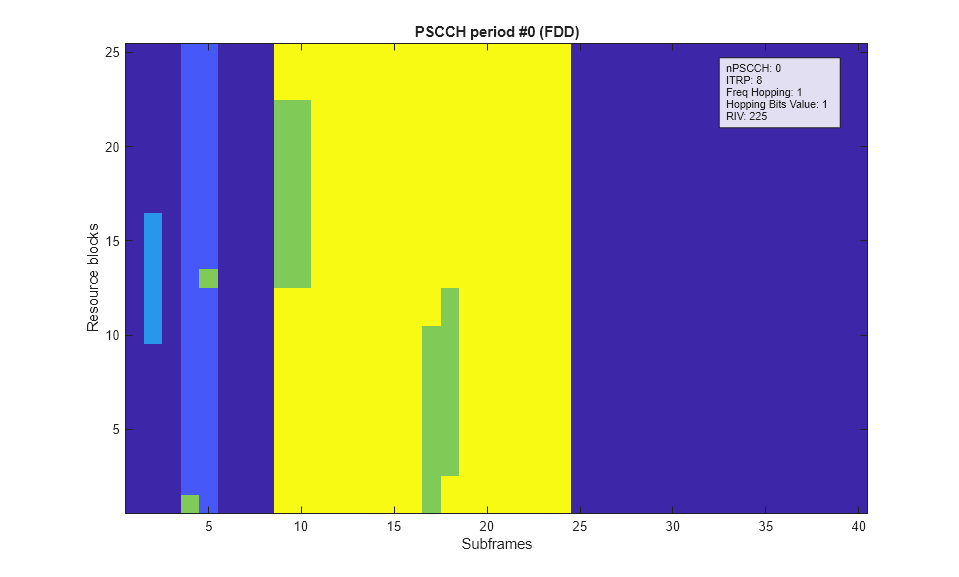 An example of the actual PSCCH and PSSCH subframes and resource blocks for transmission will be plotted. The SCI message is configured with the first PSCCH resource value PSCCHResource=0 and the first PSSCH RIV value Allocation.RIV = RIVset(1). The period.displayPeriod function is called, passing in the SCI message, and the sets of PSCCH and PSSCH subframes and resource blocks that will actually be used for transmission are plotted. The subframes and resource blocks are colored green, and are a subset of the overall control and shared resource pool, shown in blue and yellow respectively. See the LTE Sidelink Resource Pools and PSCCH Period example for more information. In accordance with the definition in TS 36.101 Table 12.2.1-1 [ 1 ], the RIV value transmitted in the SCI message (which determines the PSSCH transmission resources within the pool) will be selected randomly (uniformly) from the set RIVset, for each PSCCH period. Similarly, the PSCCH resource value (which determines the PSCCH transmission resources within the pool) will be selected randomly (uniformly) across its valid range from 0 to NumPSCCHReource-1, for each PSCCH period.