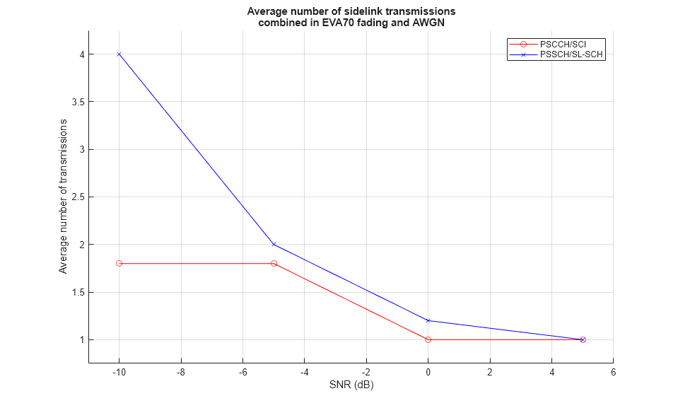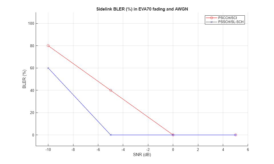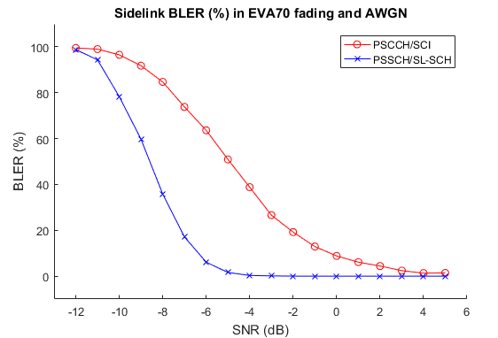 3GPP Release 12 introduced the sidelink device-to-device communications for public safety in LTE. This example generates multiple Release 12 Physical Sidelink Control Channel (PSCCH) periods containing coded PSCCH and Physical Sidelink Shared Channel (PSSCH) transmissions. The resulting PSCCH period waveforms are then passed through a frequency-selective fading channel with AWGN, and the control channel and shared channel Block Error Ratios (BLERs) are calculated for a range of SNRs. The average number of transmission instances of the control and shared channels required for successful decoding at each SNR are also calculated. For information on how to model Release 14 V2X sidelink, check the following example: Release 14 V2X Sidelink PSCCH and PSSCH Throughput.