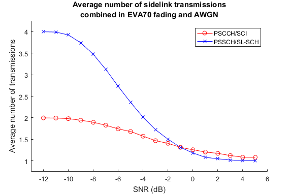 title(sprintf('Average number of sidelink transmissions\ncombined in %s fading and AWGN',fadingDescription));