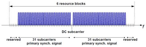 The PSS is mapped into the first 31 subcarriers either side of the DC subcarrier. Therefore, the PSS uses six resource blocks with five reserved subcarriers each side, as shown in this figure.