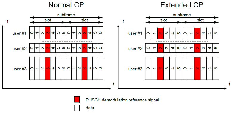 The PUSCH demodulation reference signal is mapped to the 4th SC-FDMA symbol of the slot during normal cyclic prefix and to every 3rd SC-FDMA slot during extended cyclic prefix. This resource mapping is shown in the following figure.