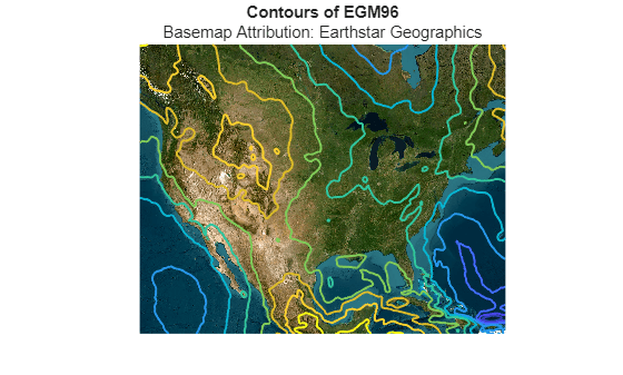 This example shows how to display contours of the Earth Gravitational Model of 1996 (EGM96) over a basemap image.