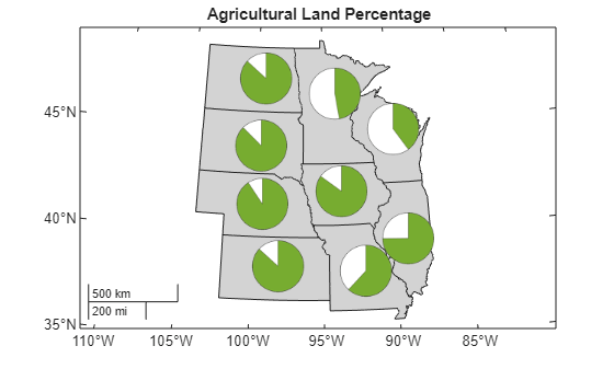 geoplot(midwest,FaceColor=[0.5 0.5 0.5])Display the agricultural land percentage for each state by using pie chart icons. The pie charts icons were created using data from the National Agricultural Statistics Service (NASS) Farms and Land in Farms 2019 Summary [1]. For each state: