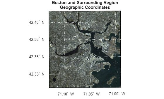 Zoom to the geographic region of the GeoTIFF image by setting the axes limits to the limits of the Boston image and add a small buffer. Note that the buffer size (delta) is expressed in meters.