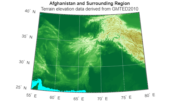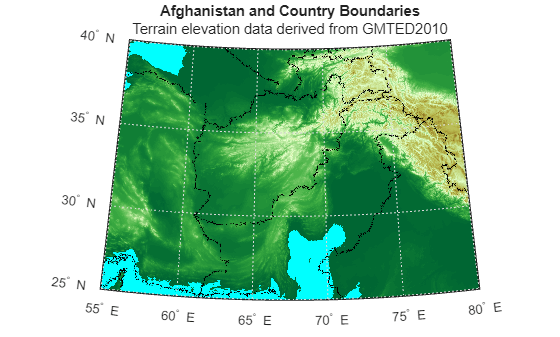 figure worldmap("Afghanistan") geoshow(ZB,R,DisplayType="texturemap") title("Afghanistan and Country Boundaries") subtitle(elevation.LayerTitle)