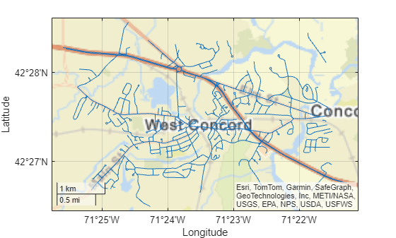 roads = shaperead("concord_roads.shp"); x = [roads.X]; y = [roads.Y]; info = shapeinfo("concord_roads.shp"); proj = info.CoordinateReferenceSystem;