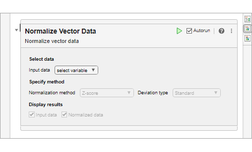 Select Normalize Vector Data from the list. MATLAB adds the Normalize Vector Data task to the live script.
