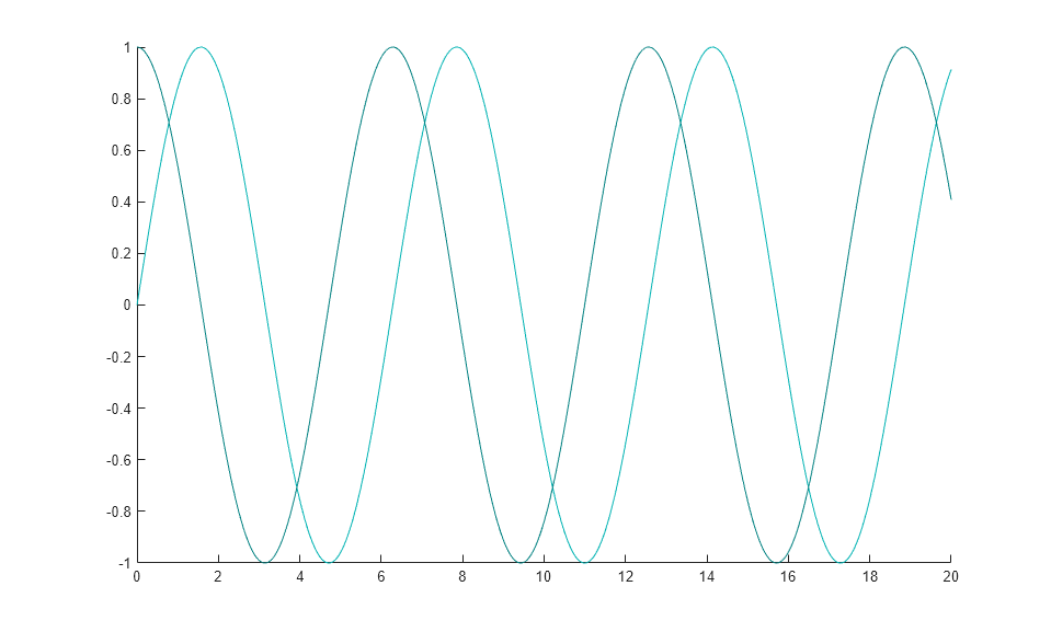 a1 = animatedline('Color',[0 .7 .7]); a2 = animatedline('Color',[0 .5 .5]); axis([0 20 -1 1]) drawnow x = linspace(0,20,10000); for k = 1:length(x) % first line xk = x(k); ysin = sin(xk); addpoints(a1,xk,ysin); % second line ycos = cos(xk); addpoints(a2,xk,ycos); % update screen drawnow limitrate end