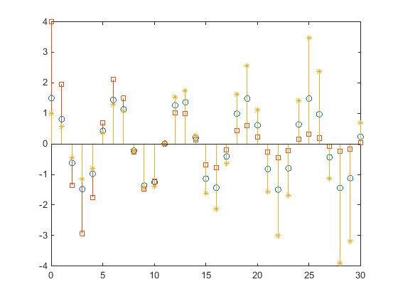 x = 0:30; y = [1.5*cos(x);4*exp(-.1*x).*cos(x);exp(.05*x).*cos(x)]'; h = stem(x,y); h(1).Marker = 'o'; h(1).Tag = 'Decaying Exponential'; h(2).Marker = 'square'; h(2).Tag = 'Growing Exponential'; h(3).Marker = '*'; h(3).Tag = 'Steady State';