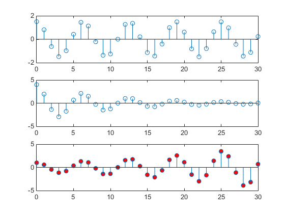 x = 0:30; y = [1.5*cos(x);4*exp(-.1*x).*cos(x);exp(.05*x).*cos(x)]'; tiledlayout(3,1) ax1 = nexttile; stem(x,y(:,1)) ax2 = nexttile; stem(x,y(:,2)) ax3 = nexttile; stem(x,y(:,3))