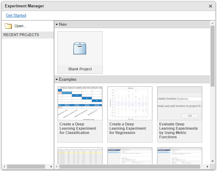 3. If you have Deep Learning Toolbox or Statistics and Machine Learning Toolbox, Experiment Manager opens a second dialog box that lists several templates to support your AI workflows. Under Blank Experiments, select General Purpose.