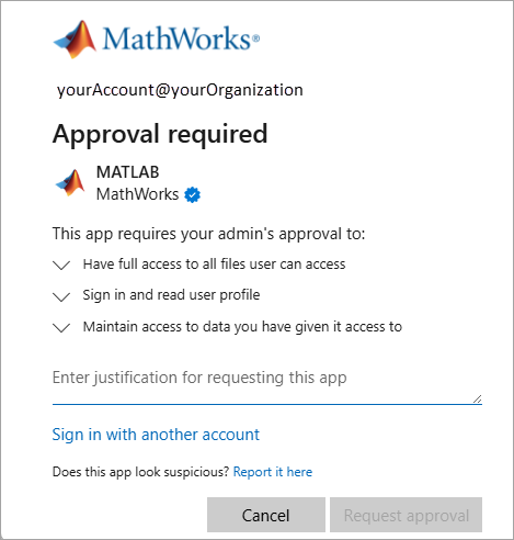 Under certain circumstances, typically when using OneDrive for work or school, an administrator might need to grant permission to connect to your OneDrive account in MATLAB.